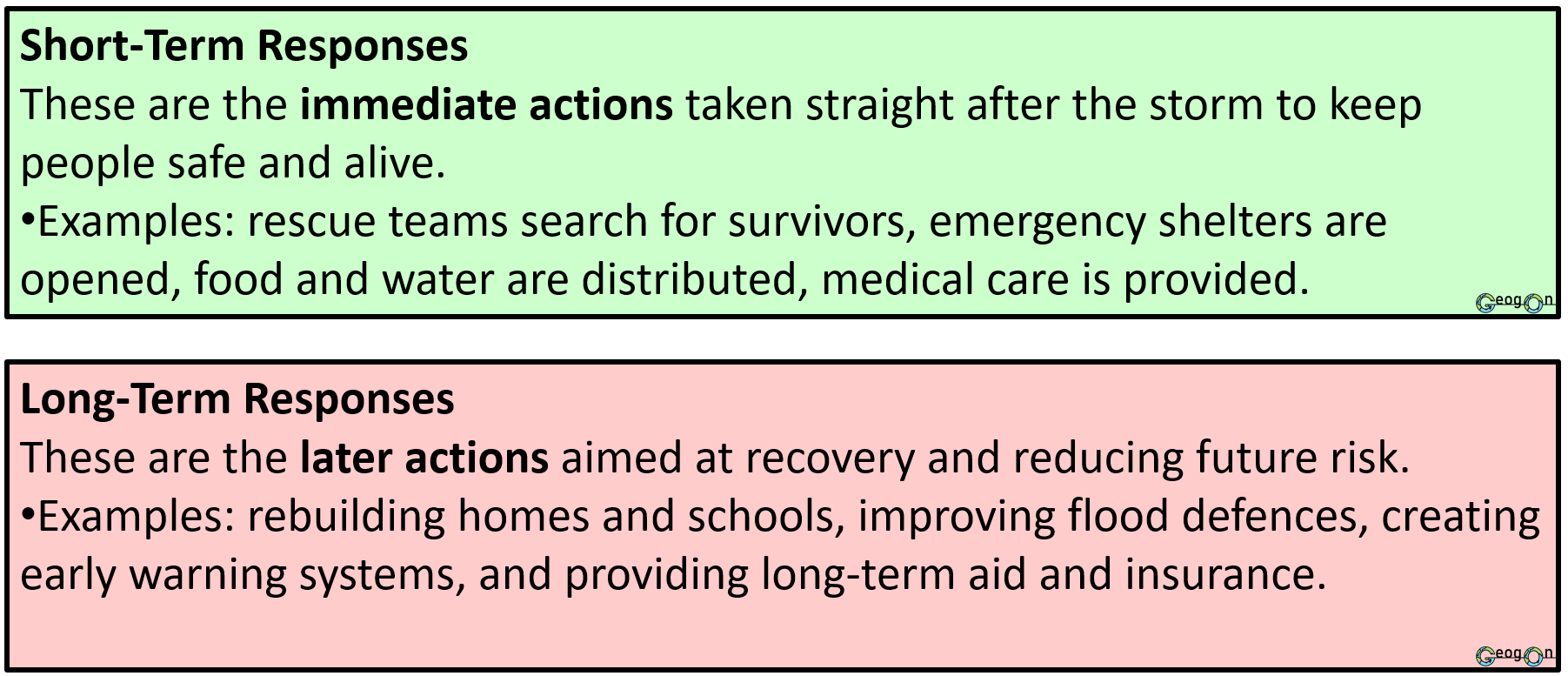 Tropical storms can cause widespread social, economic, and environmental impacts. Strong winds destroy homes, power lines, and crops, while heavy rainfall and storm surges lead to flooding, landslides, and water contamination. Economically, transport networks and businesses are disrupted, and rebuilding costs can reach billions. The severity of these impacts often depends on a country’s level of economic development. In low-income countries (LICs), weaker infrastructure, limited forecasting systems, and slower emergency responses lead to higher death tolls and slower recovery. In contrast, high-income countries (HICs) like the USA can reduce impacts through early warning systems, evacuation plans, and stronger buildings, though financial losses are often higher due to the value of assets damaged.