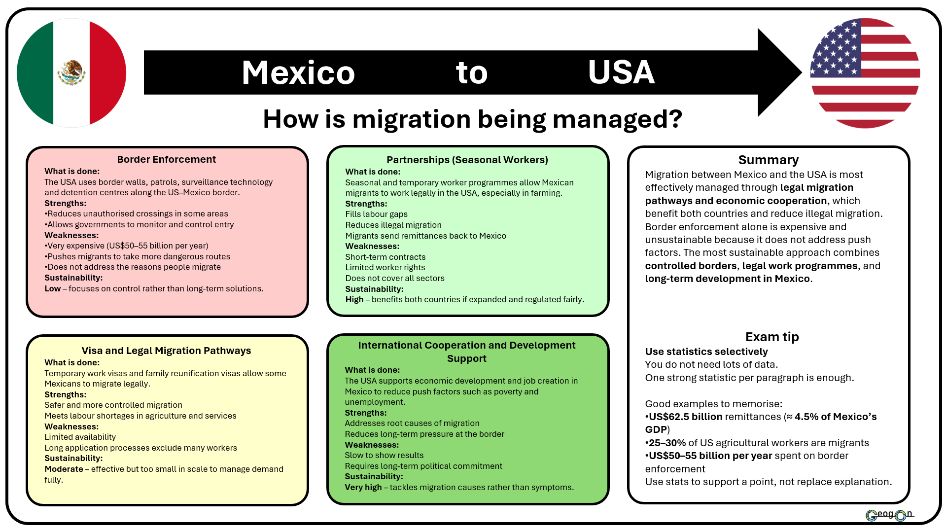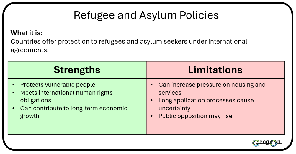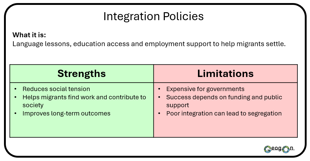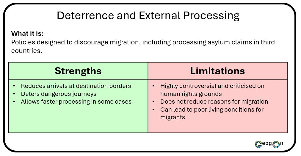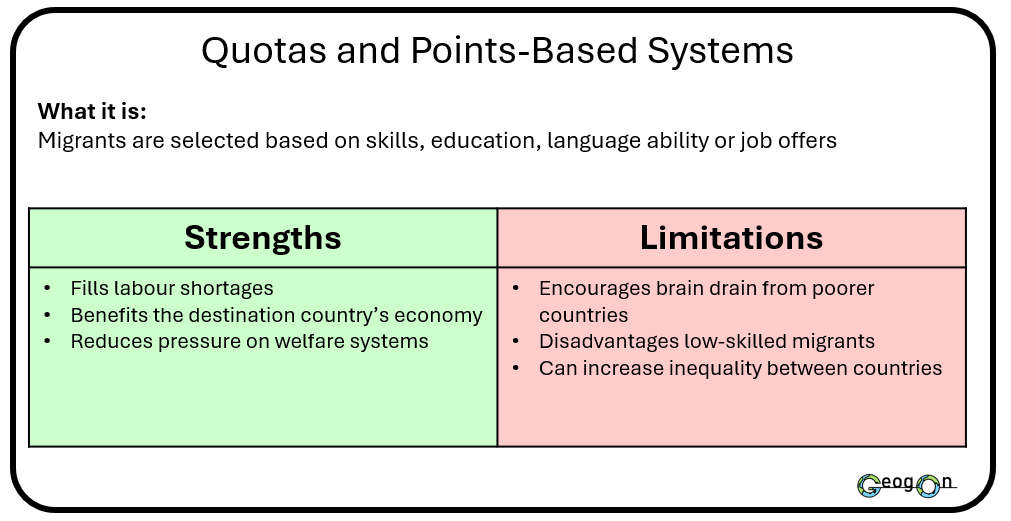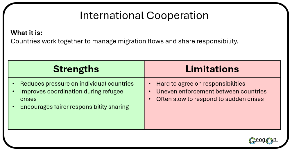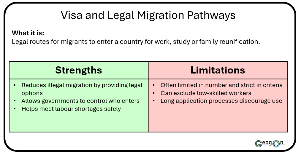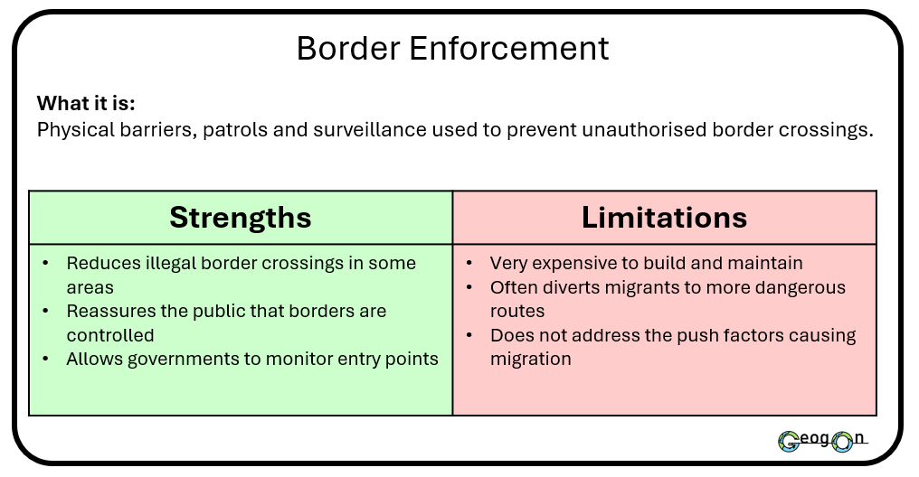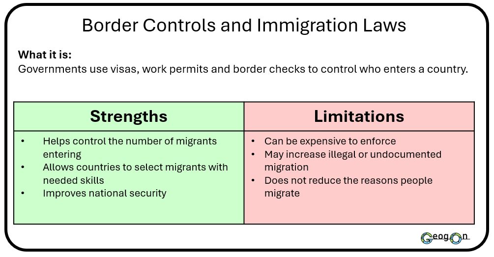 Governments use a range of methods and techniques to manage international migration, including border enforcement, visa systems and international agreements. These strategies aim to control migrant numbers, protect national security and meet economic needs. However, each approach has strengths and weaknesses. Some methods are effective at reducing arrivals but do not address the reasons people migrate, while others support long-term management but are costly or politically challenging.