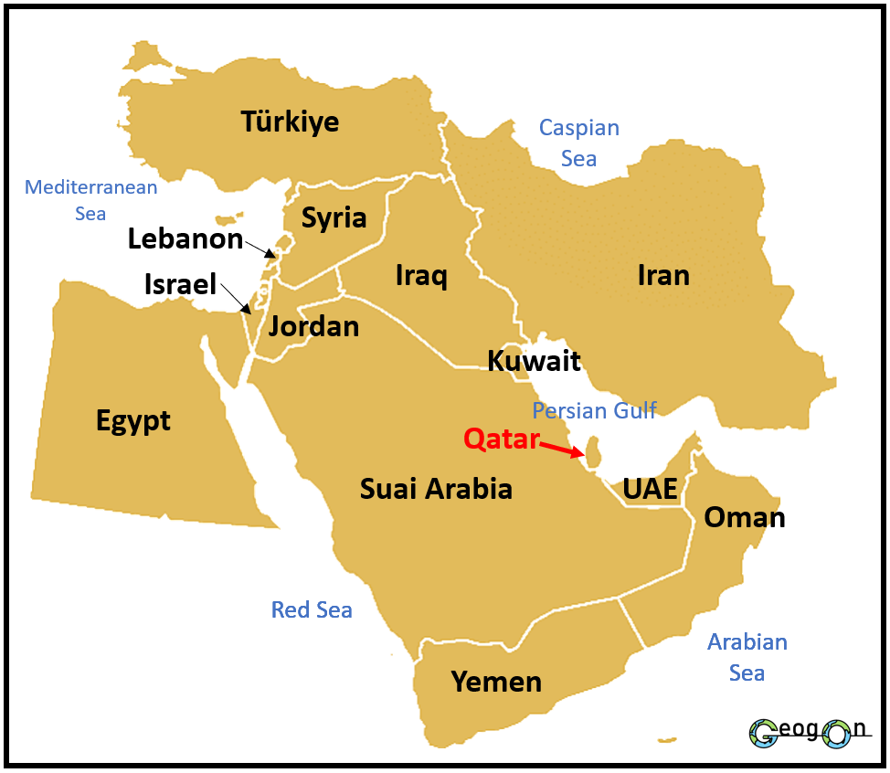 Qatar is located in the Middle East, on the Arabian Peninsula. It is bordered by the Persian Gulf on the north and east, the Gulf of Bahrain on the northwest, and shares a land border with Saudi Arabia to the southwest. The country is also close to the UAE and Bahrain.